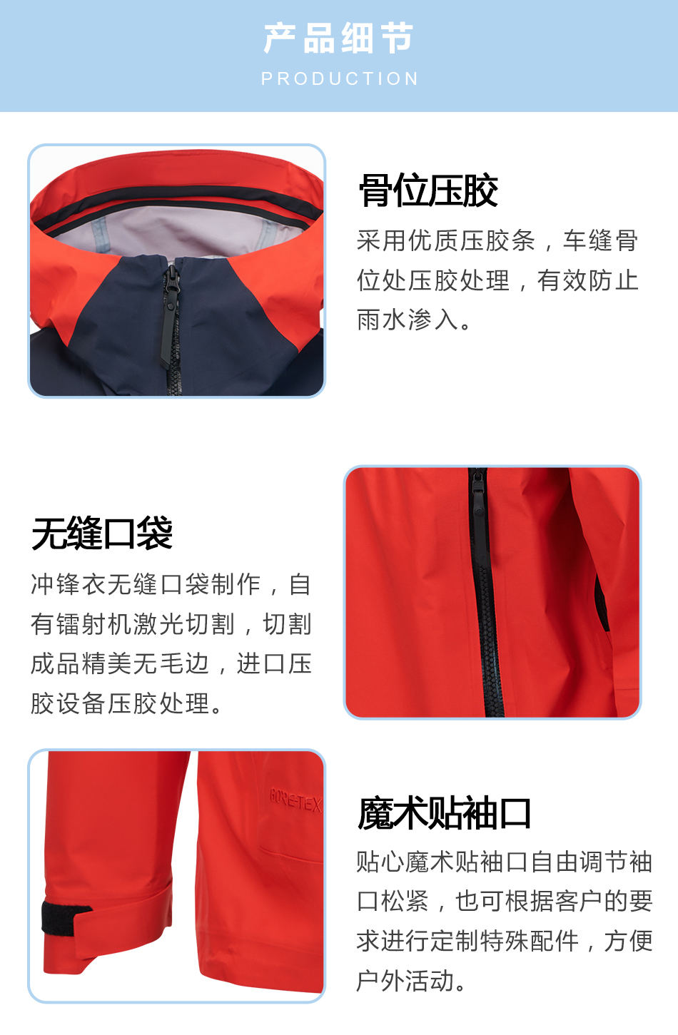 • 骨位壓膠:采用優質壓膠條,車縫骨位處壓膠處理,有效防止雨水滲入。